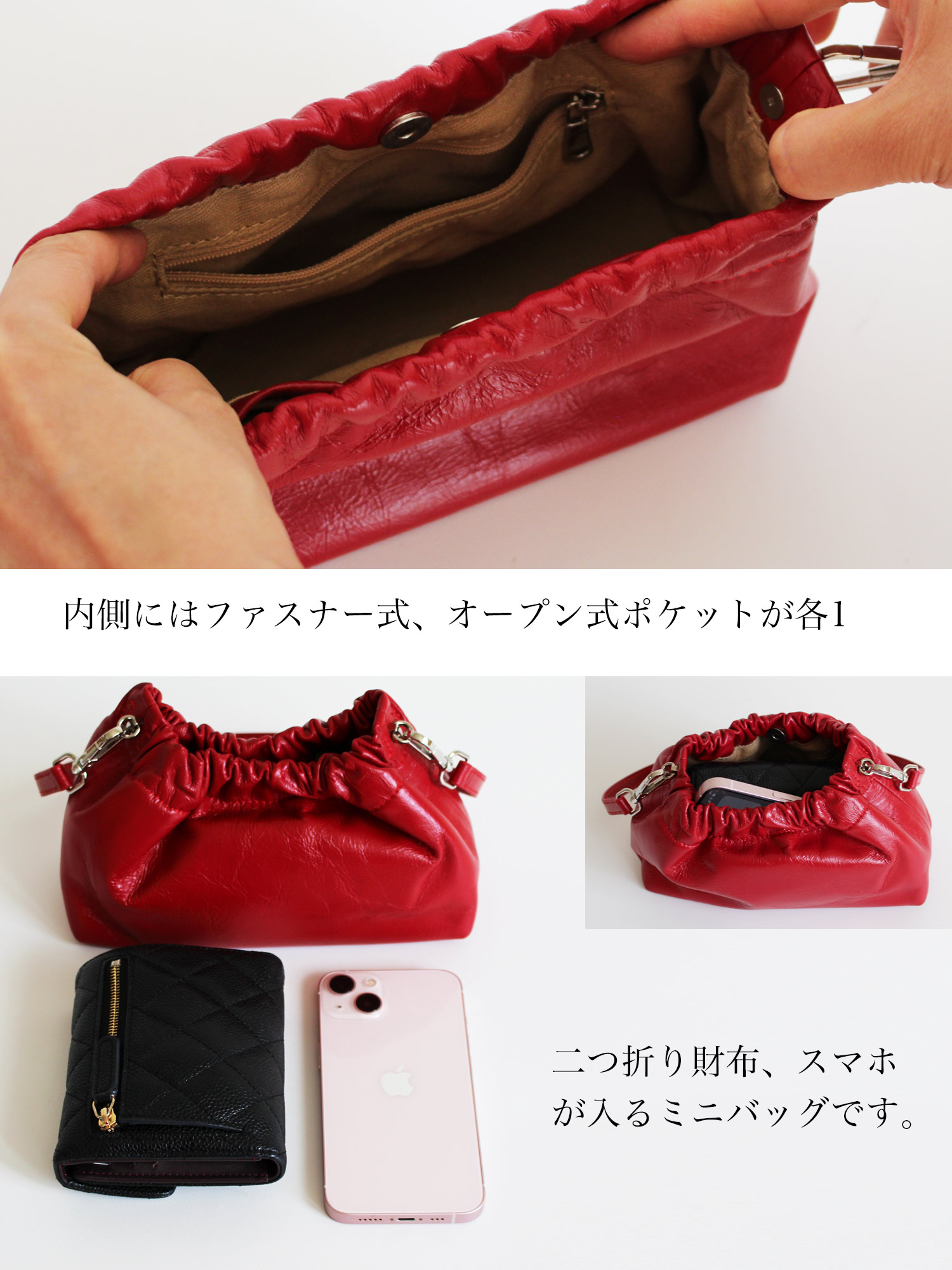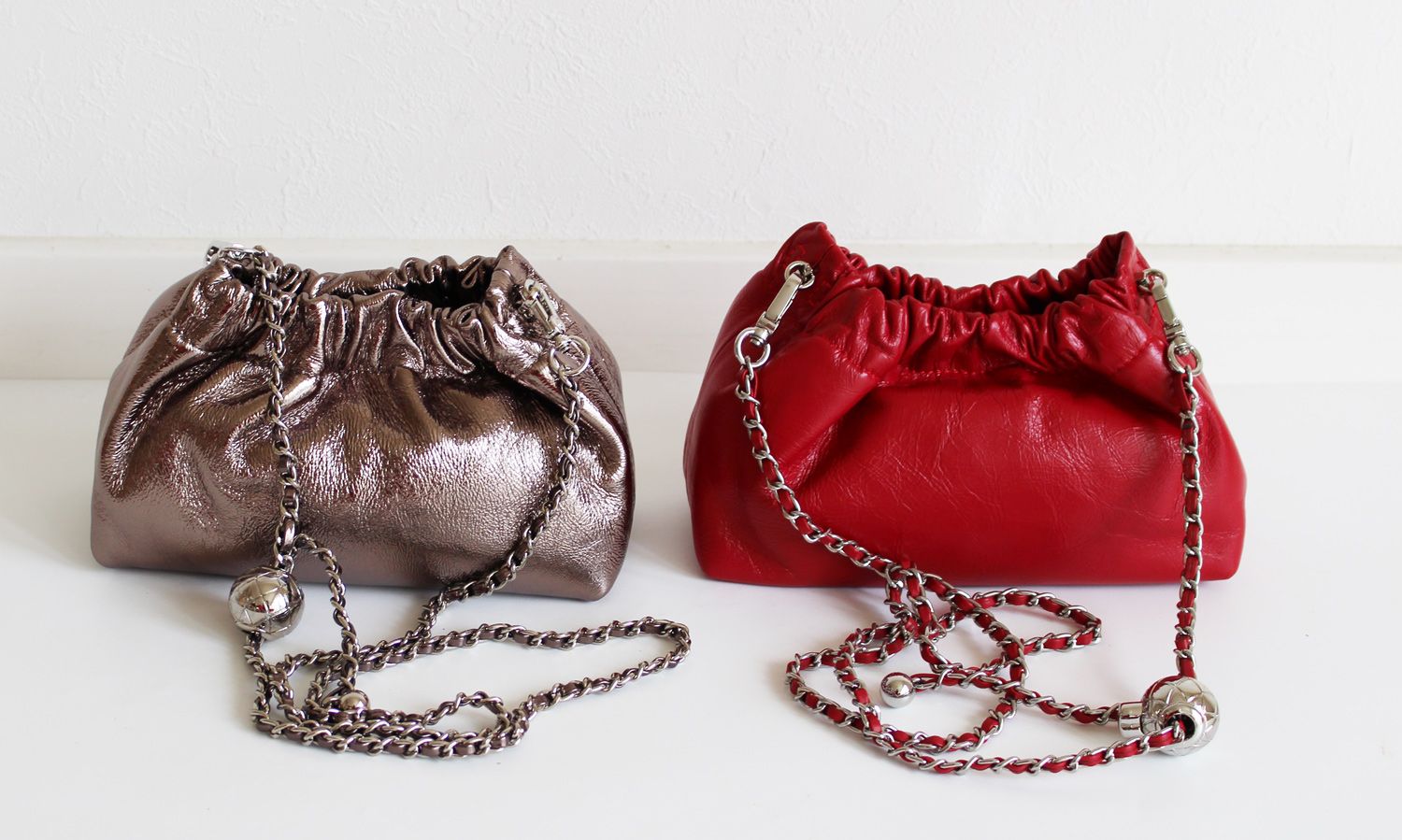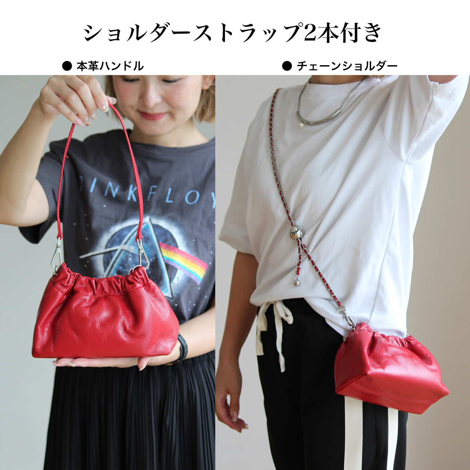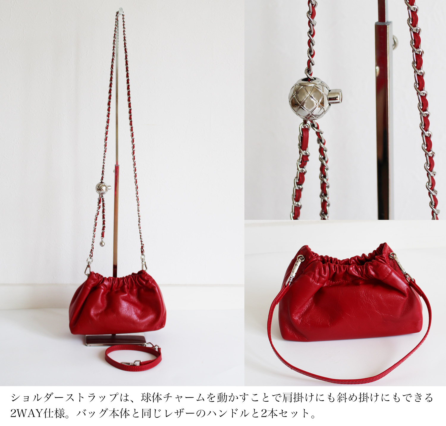 コーティング牛革の素材感と、立体的なタックが女性らしさを演出するミニバッグ。 ショルダーストラップは、チェーンを動かすことで長さ調整ができ、斜め掛けもできる2WAY仕様。 レザーストラップとチェーンの2本セットは、コーデの幅が広がり華やかさをプラスしてくれます。 トレンドのシアー素材やレースアイテムに合わせた女性らしい装いからカジュアルスタイルもこなれ感が出ておすすめ。 デイリー使いにはもちろん、ドレスアップしたパーティースタイルにも。
