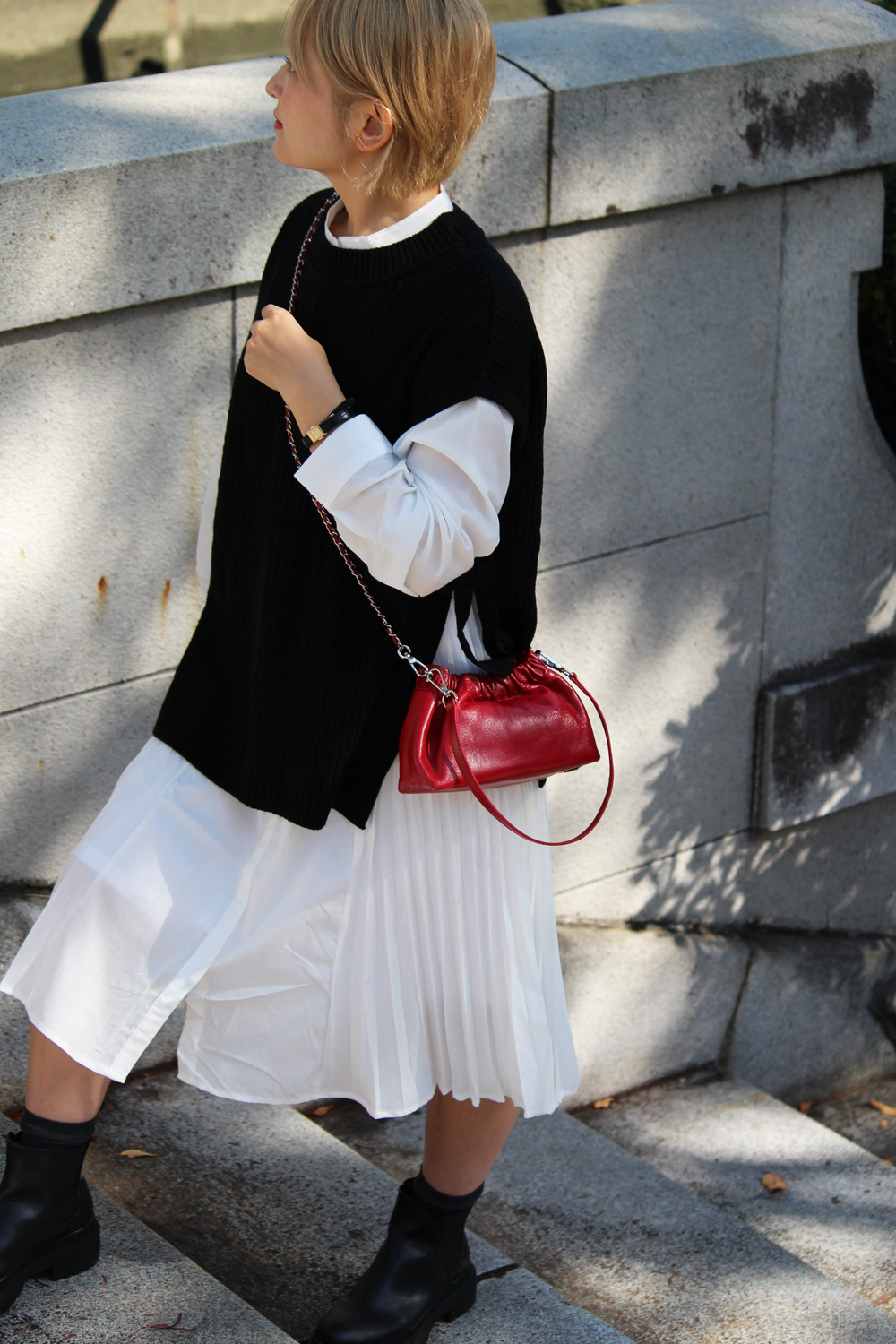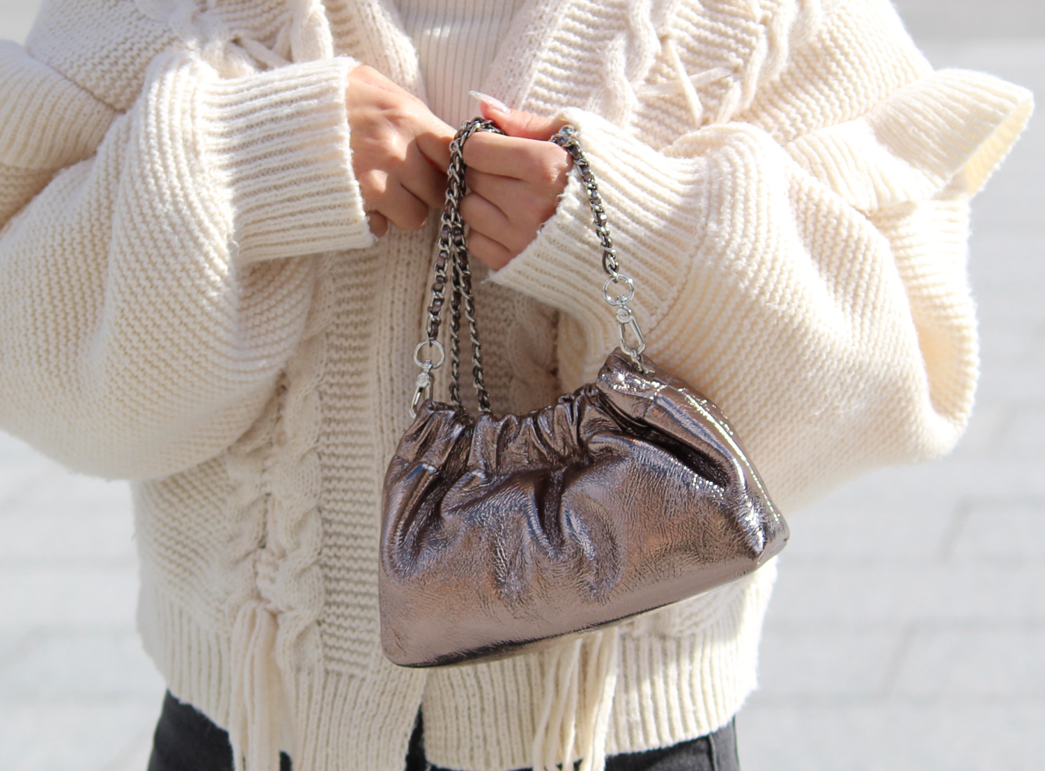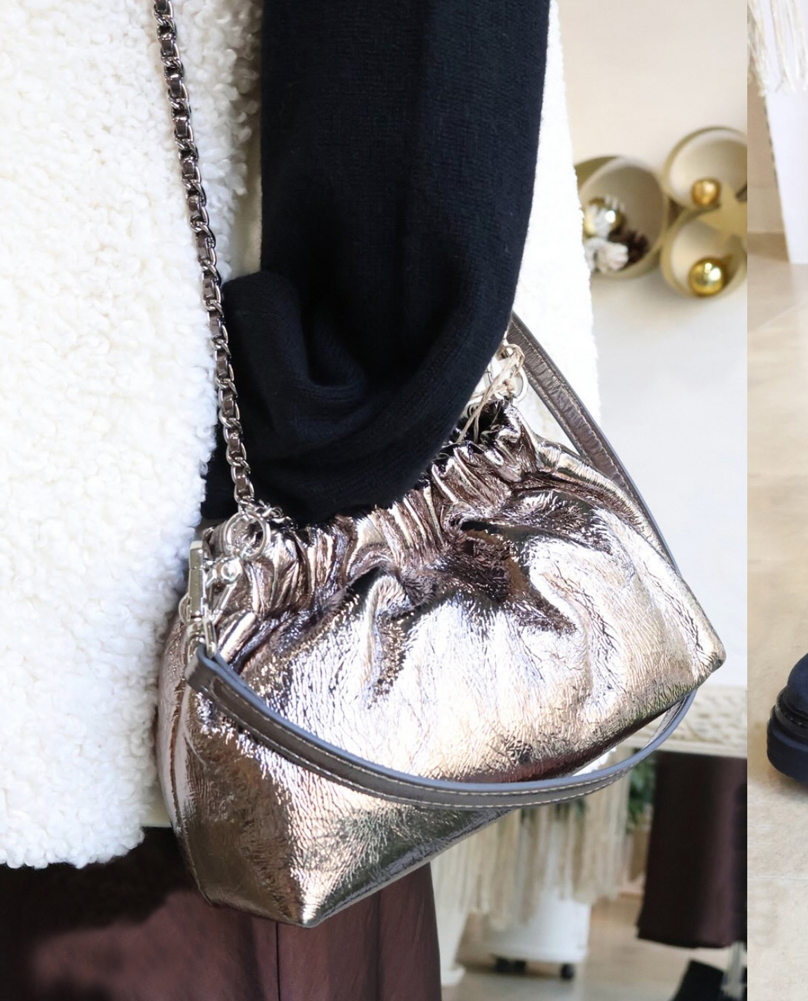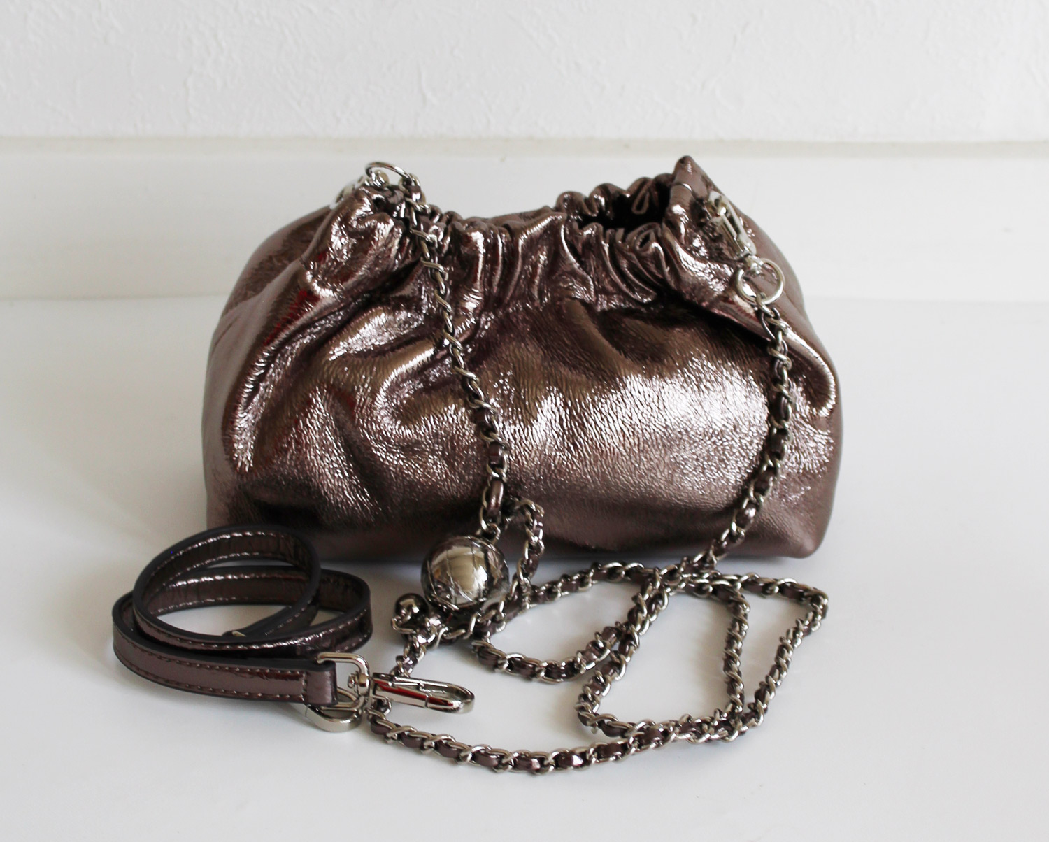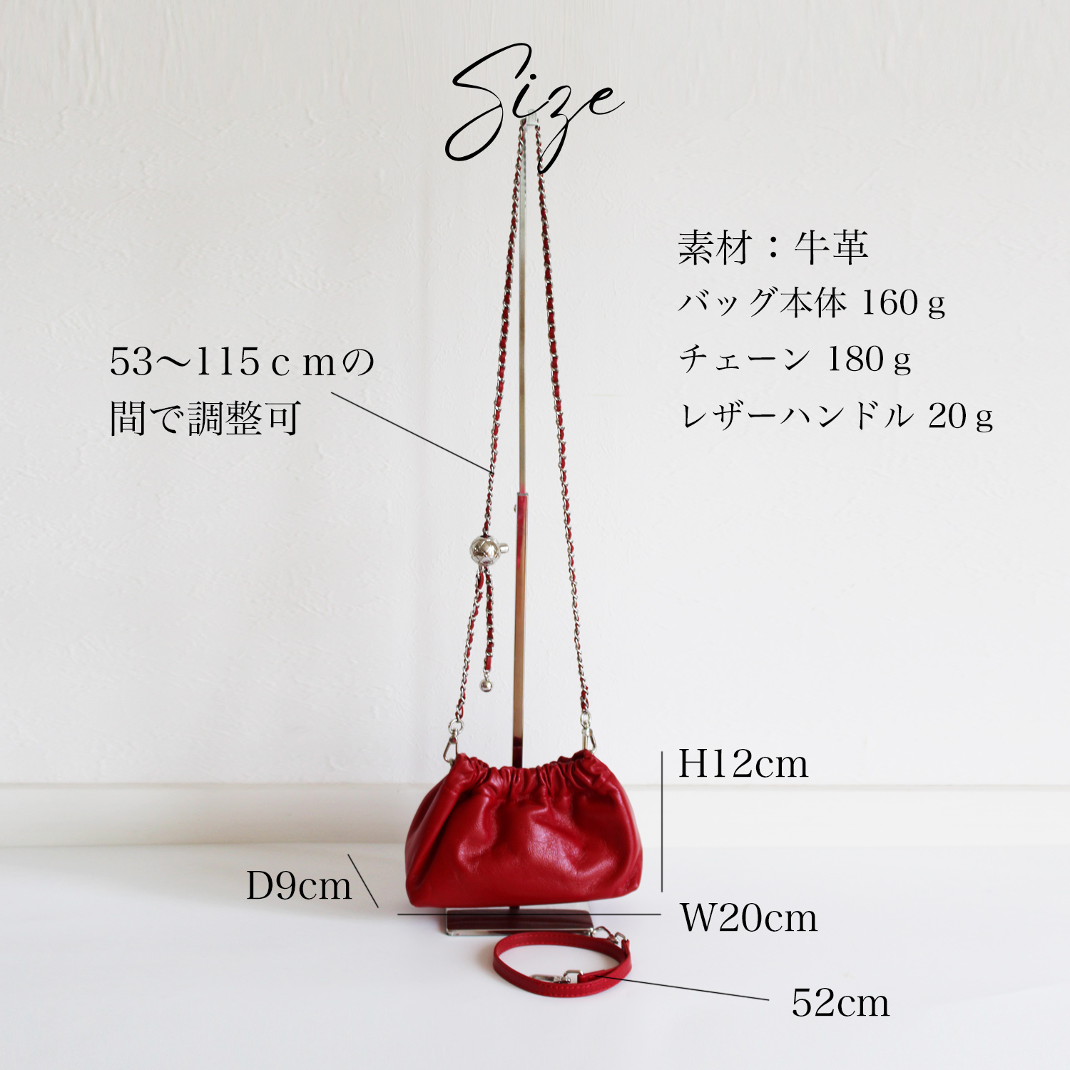 コーティング牛革の素材感と、立体的なタックが女性らしさを演出するミニバッグ。 ショルダーストラップは、チェーンを動かすことで長さ調整ができ、斜め掛けもできる2WAY仕様。 レザーストラップとチェーンの2本セットは、コーデの幅が広がり華やかさをプラスしてくれます。 トレンドのシアー素材やレースアイテムに合わせた女性らしい装いからカジュアルスタイルもこなれ感が出ておすすめ。 デイリー使いにはもちろん、ドレスアップしたパーティースタイルにも。