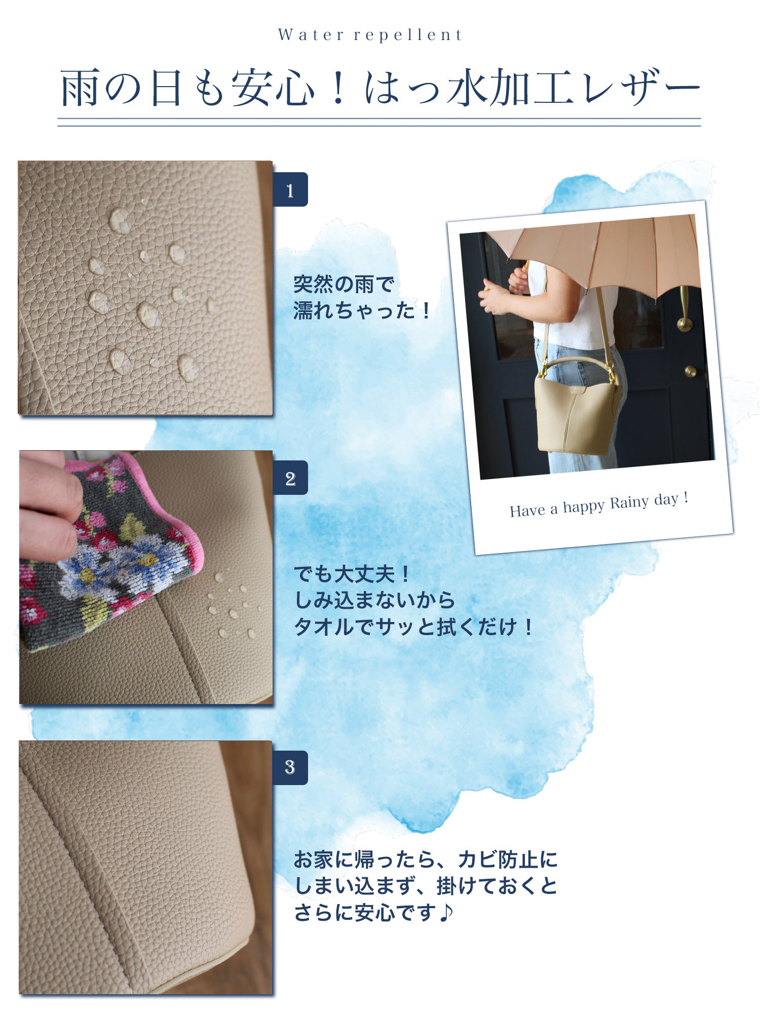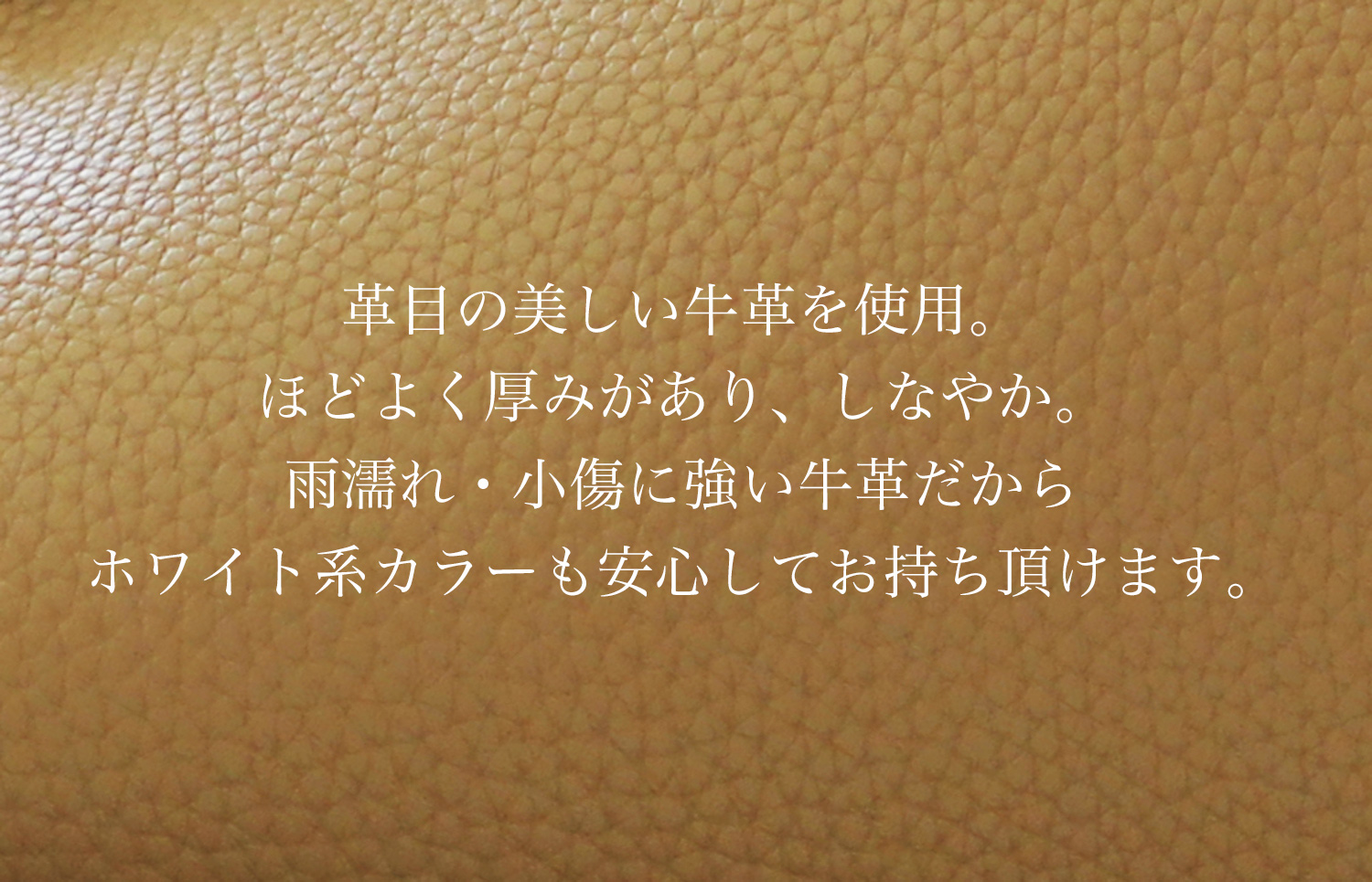上質な牛革は小傷や汚れに強く、タンパク質コーティング加工で雨に濡れてもサッと拭くだけ。