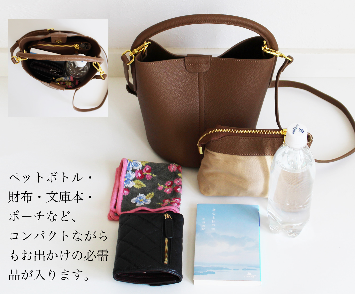 見た目はコンパクトなのに、長財布や500mlボトルがしっかり入る収納力。インバッグ付きで荷物もきれいに整理できます。