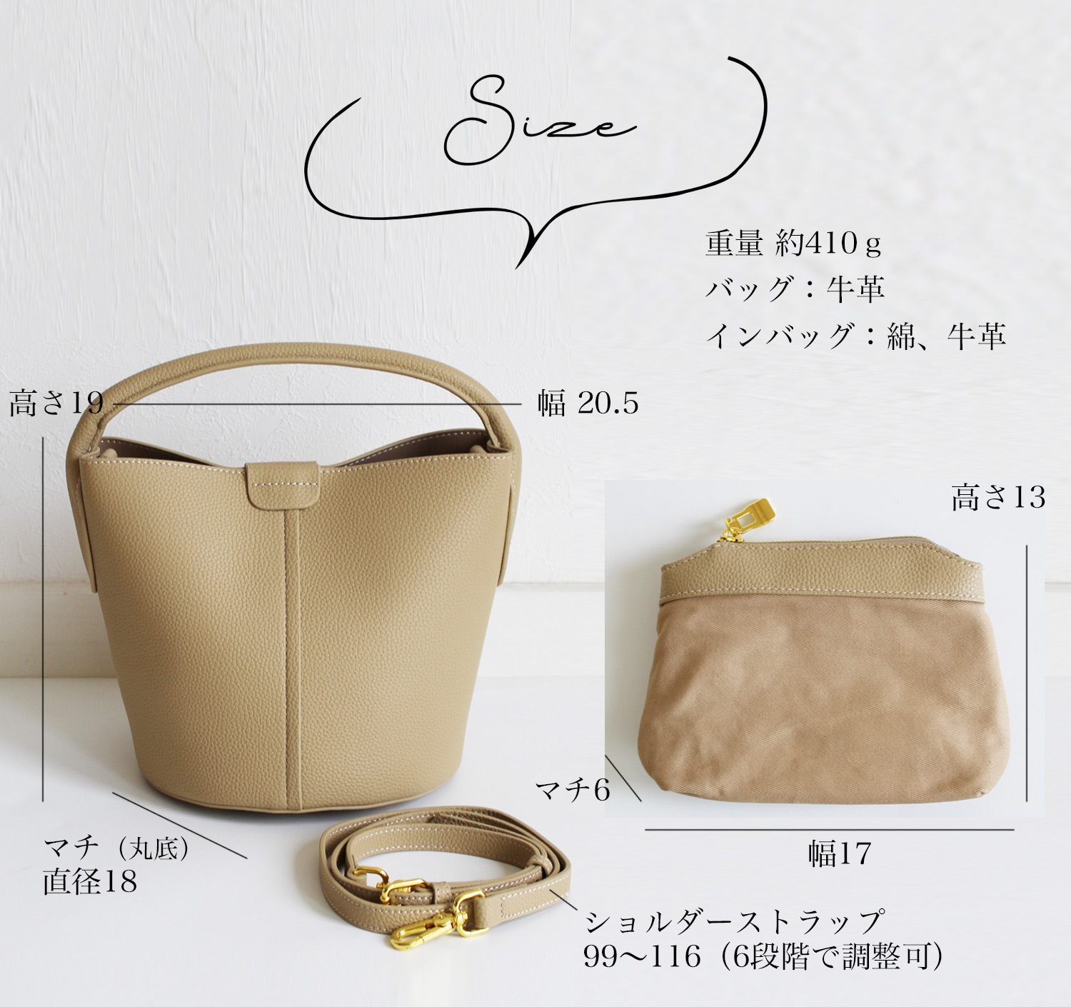 バッグ本体:H19、W20.5、D18