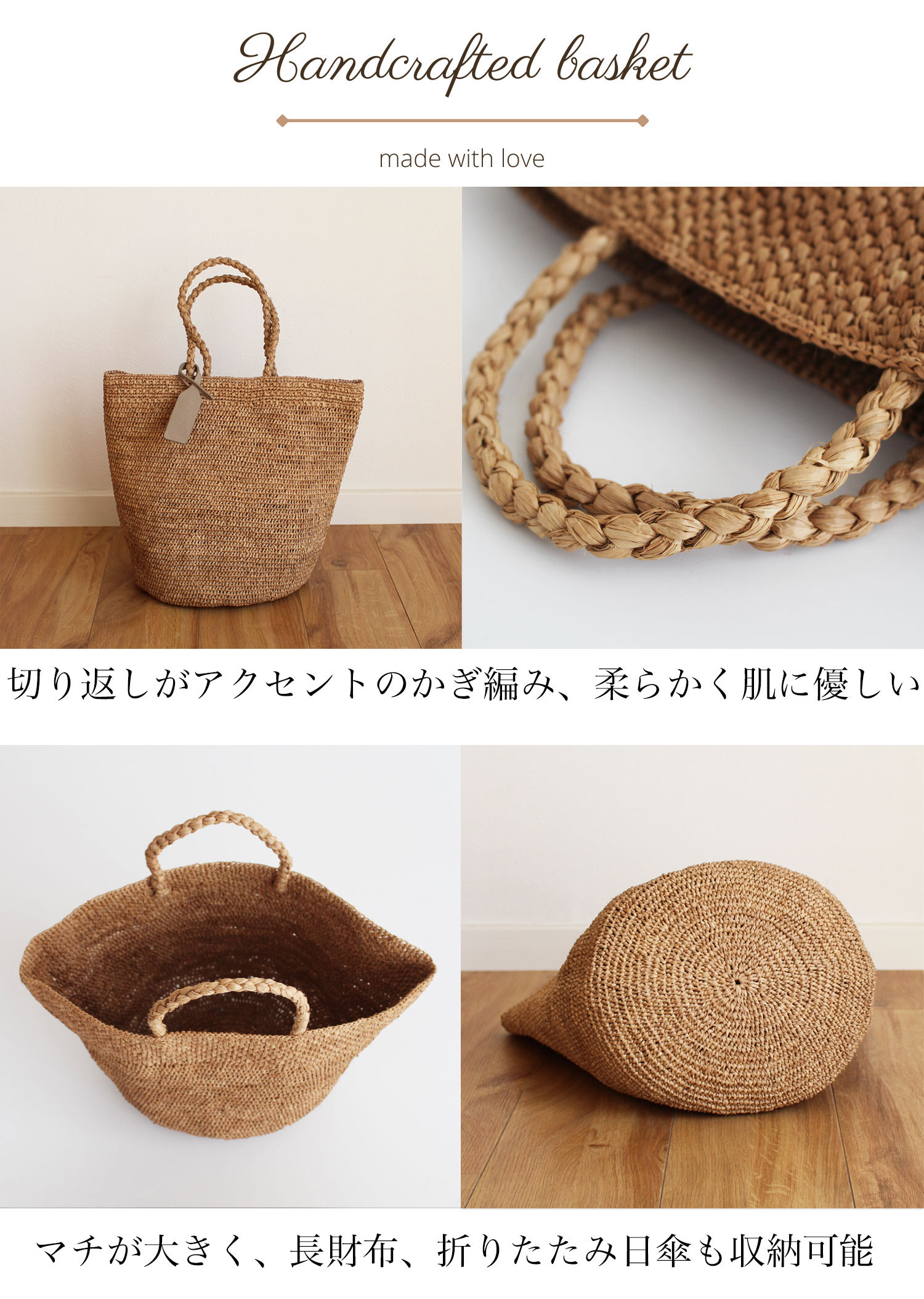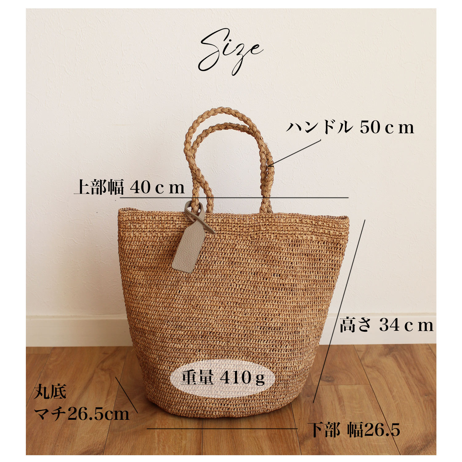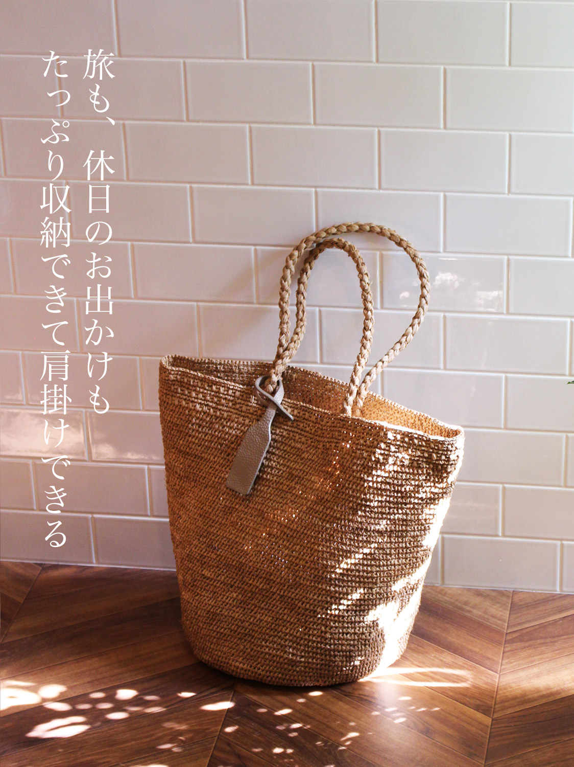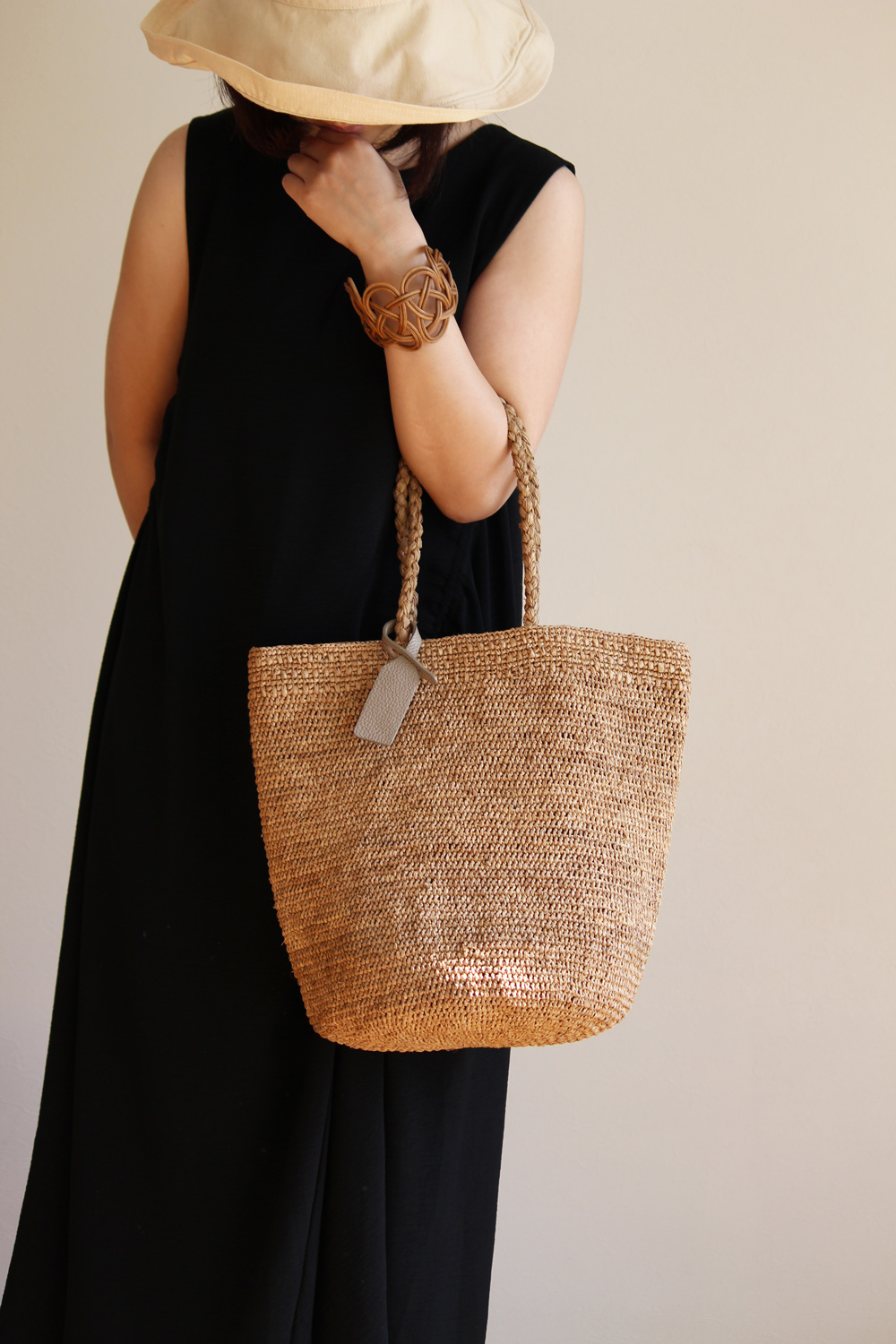 帽子やバッグの特に品質が高く、軽く特有の柔軟性が有り高級素材として、ここ数年人気が高まっているマダガスカル島産ラフィアをマダガスカルの技術を使い作り上げたハンドメイドバッグです。