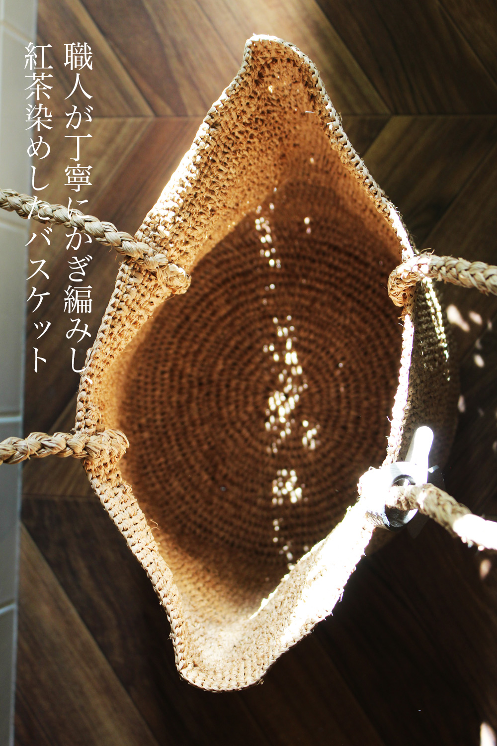 Soldout 【予約注文/2026年2月末から順次発送】[送料無料] 名前・イニシャル刻印つき マダガスカル産ラフィアかぎ編み紅茶染めバスケット かごバッグ